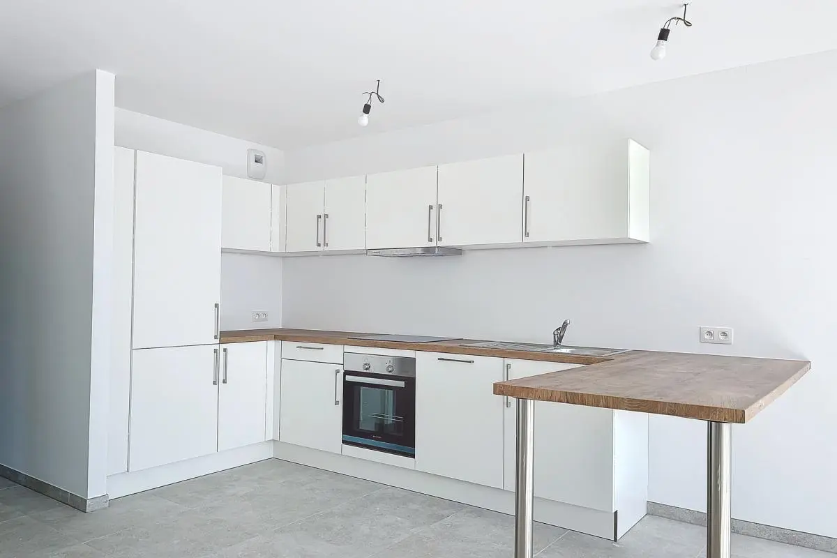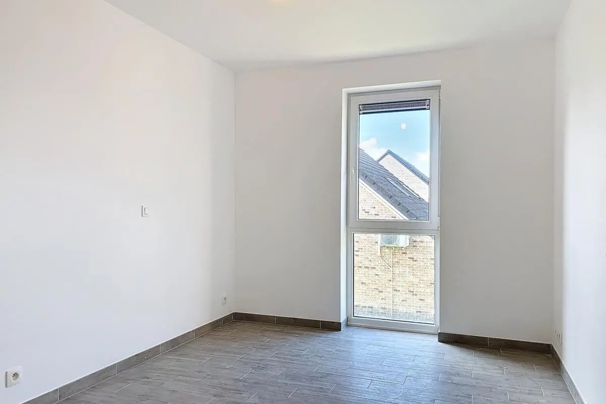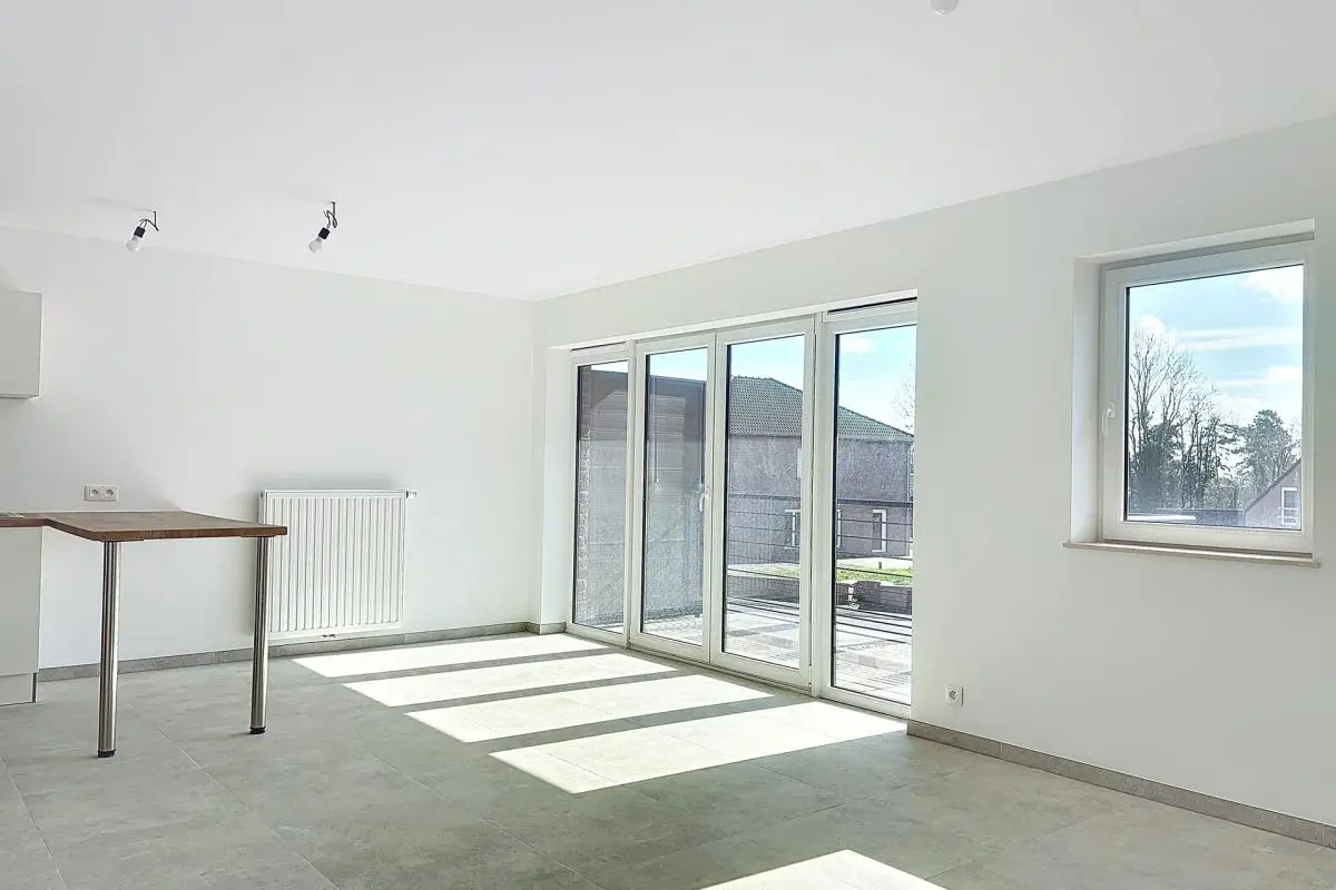Dans une copropriété neuve, magnifique appartement avec terrasse-avant bien orientée. Il se compose d'un hall d'entrée, une magnifique cuisine américaine entièrement équipée avec four, hotte, taque, frigo, congélateur, lave-vaisselle, une buanderie avec chaudière et espace machine à laver, séchoir à condensation, un wc séparé, une salle de douche avec évier et enfin deux chambres avec vue sur la verdure. L'appartement sera totalement équipé au niveau des luminaires et des rideaux/stores seront placés. L'appartement vient d'être peint, le futur locataire peut déposer ses valises. Emplacement de parking intérieur sécurisé. PEB B. DISPONIBLE TOUT DE SUITE.